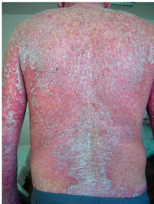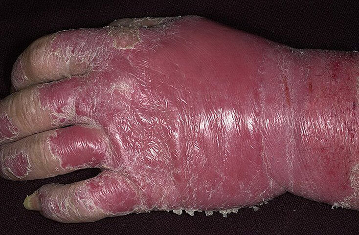 Псориатик эритродерма асоратлари бўлган 35 ёшли эркакнинг қўли: